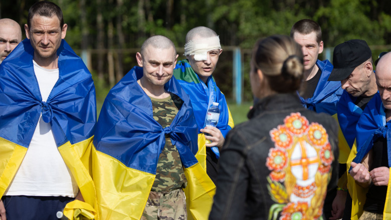 Un videoclip ucrainean a arătat prizonieri de război care zâmbesc în timp ce ies dintr-un autobuz într-o locaţie nedezvăluită, înfăşuraţi în steaguri ale Ucrainei sau ale unităţilor lor, unii dintre ei strigând „Glorie Ucrainei.”